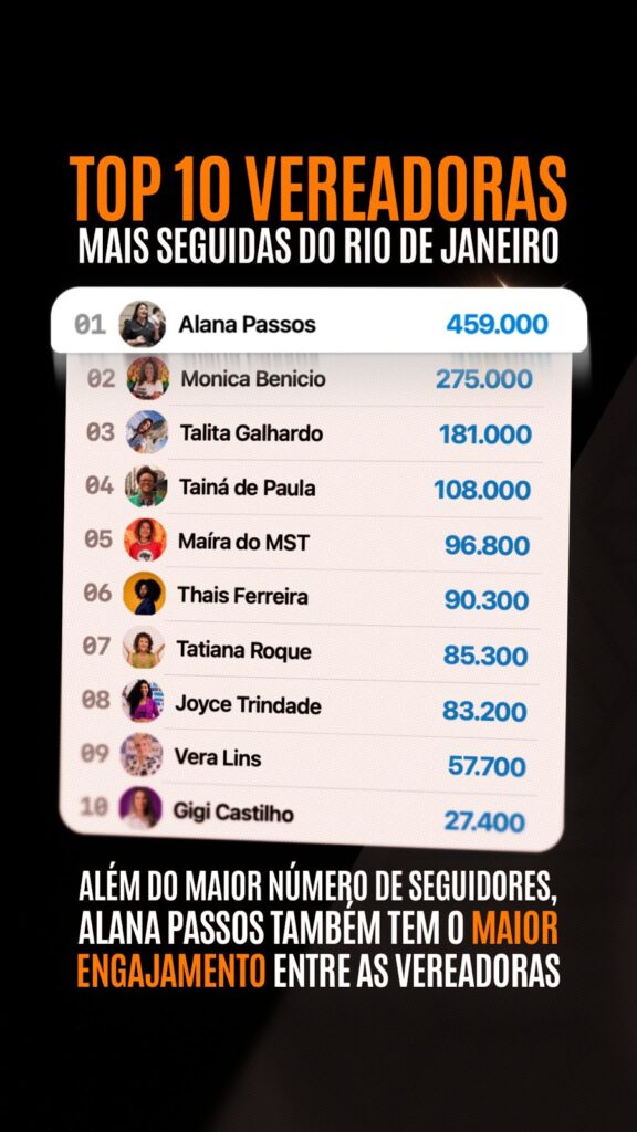 A disputa política de 2026 não corre só nos bastidores do Palácio Guanabara, da Câmara dos Deputados ou da Alerj. Ela também passa pela tela do celular. E, nesse terreno, Alana Passos (PL) abriu vantagem sobre as colegas da Câmara do Rio: com 459 mil seguidores, a parlamentar lidera em atividade, engajamento e seguidores entre as vereadoras cariocas.