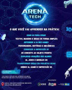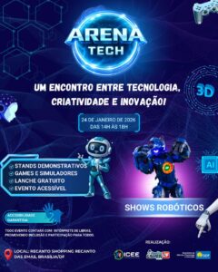 O Recanto das Emas recebe, no próximo dia 24 de janeiro, o evento Arena Tech, uma iniciativa gratuita voltada à tecnologia, inovação e inclusão digital. A programação acontece das 14h às 18h, no Recanto Shopping, na Praça dos Espelhos, e é aberta a toda a comunidade.