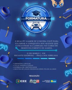 A cerimônia de formatura dos alunos do curso de Desenvolvimento de Games do projeto Reality Gamer DF será realizada no dia 21 de março, a partir das 13h, no Recanto Shopping, na Praça dos Espelhos. O evento marca a conclusão de uma jornada voltada ao aprendizado, criatividade, inovação e inclusão na área tecnológica.